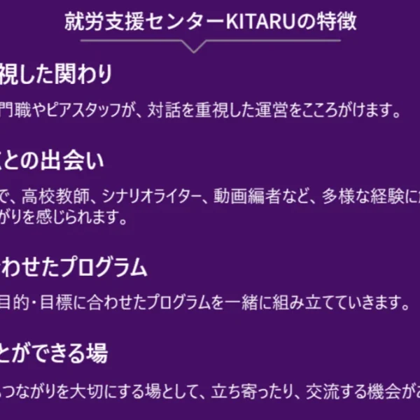 就労支援センターKITARUでは、就労移行支援、自立訓練(生活訓練)と合わせて就労定着支援を行っています。この事業は、就労6カ月後から最大3年間、職場訪問や面談を通じて、職場やはたらく上での生活相談に応じます。 またこの事業以外にも、ワーカーズミーティング(第2、最終金曜日17:30~19:00)は、就労移行支援を卒業した人が来所できる機会を提供しています。 スタッフとの関わりでは、就労移行支援より卒業してからの関わりの方が長い人もいて “帰ってくることができる場所”という考え方を大切にしています。