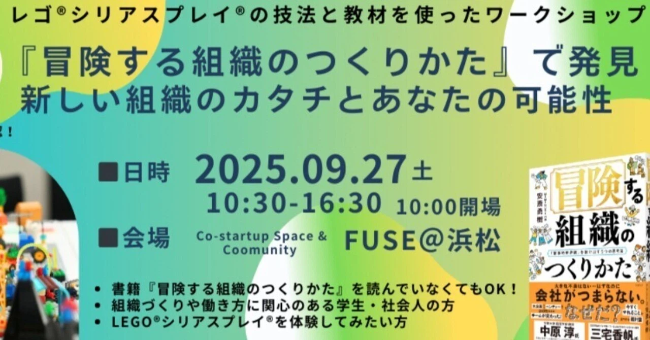 浜松で開催されたレゴ®シリアスプレイ®の技法と教材を使ったワークショップに参加をしました。このワークショップは、『冒険する組織のつくりかた』の著者である安斎勇樹さん公認のワークショップとして、Rt(ラフ)河口哲也さんが主催され、当日は10名以上の人が参加をしていました。