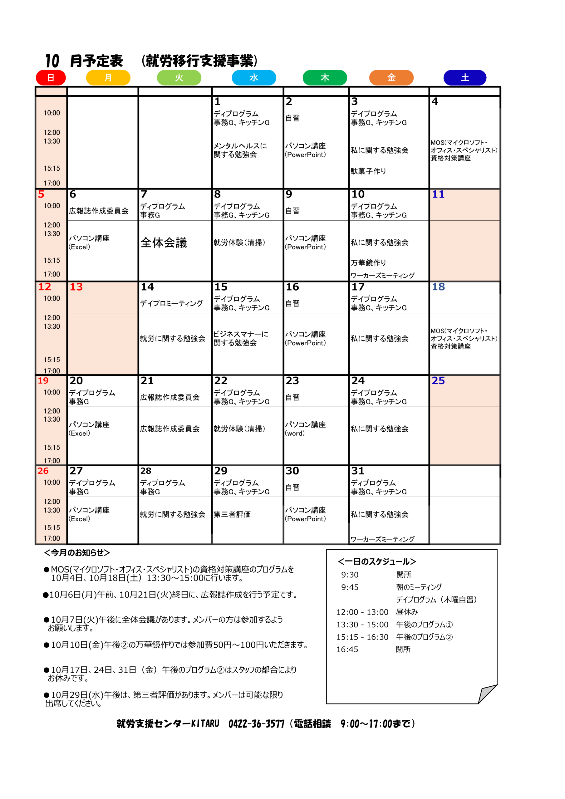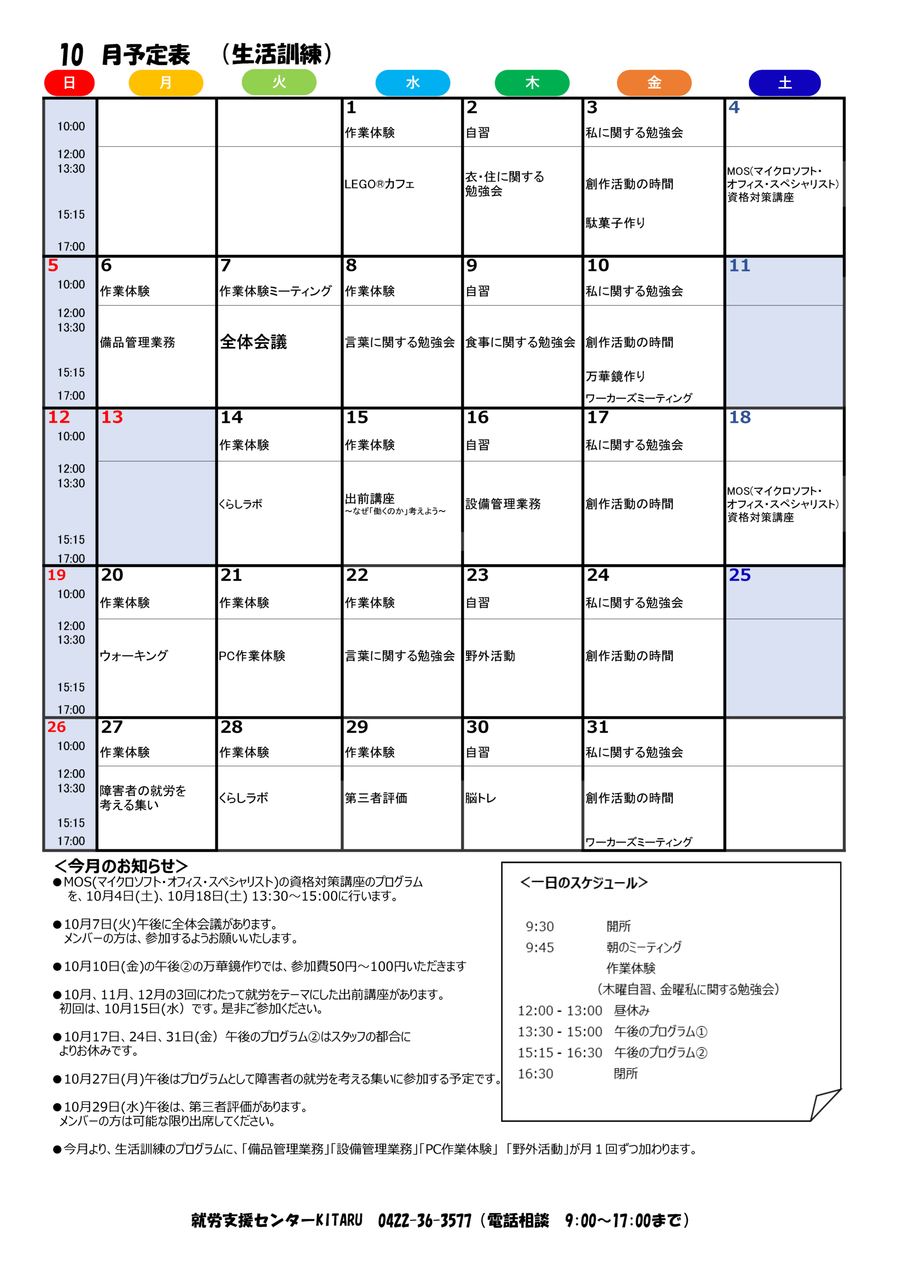 2025.09.30 2025年10月のプログラムを公開しました 就労移行支援2025年10月 生活訓練2025年10月 Post Share Hatena Line RSS feedly Pin it note 広報誌『KITARU’s COMPASS』10月号を発行しました 前の記事