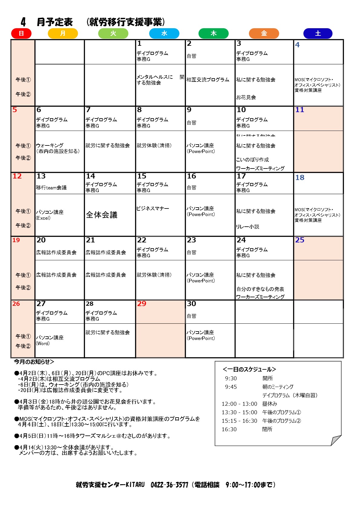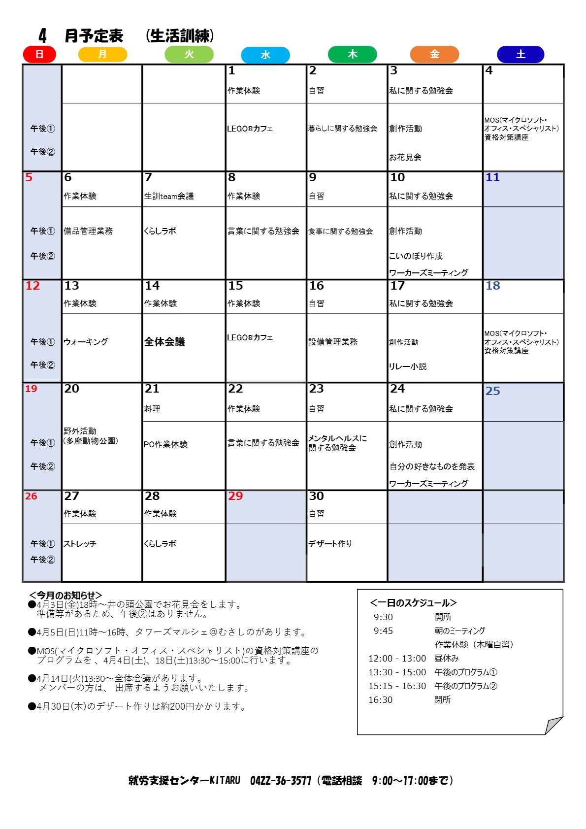 2026.04.01 2026年4月のプログラムを公開しました 就労移行支援2026年4月 生活訓練2026年4月 Post Share Hatena Line RSS feedly Pin it note 広報誌『KITARU’s COMPASS』2026年4月号を発行しました 前の記事